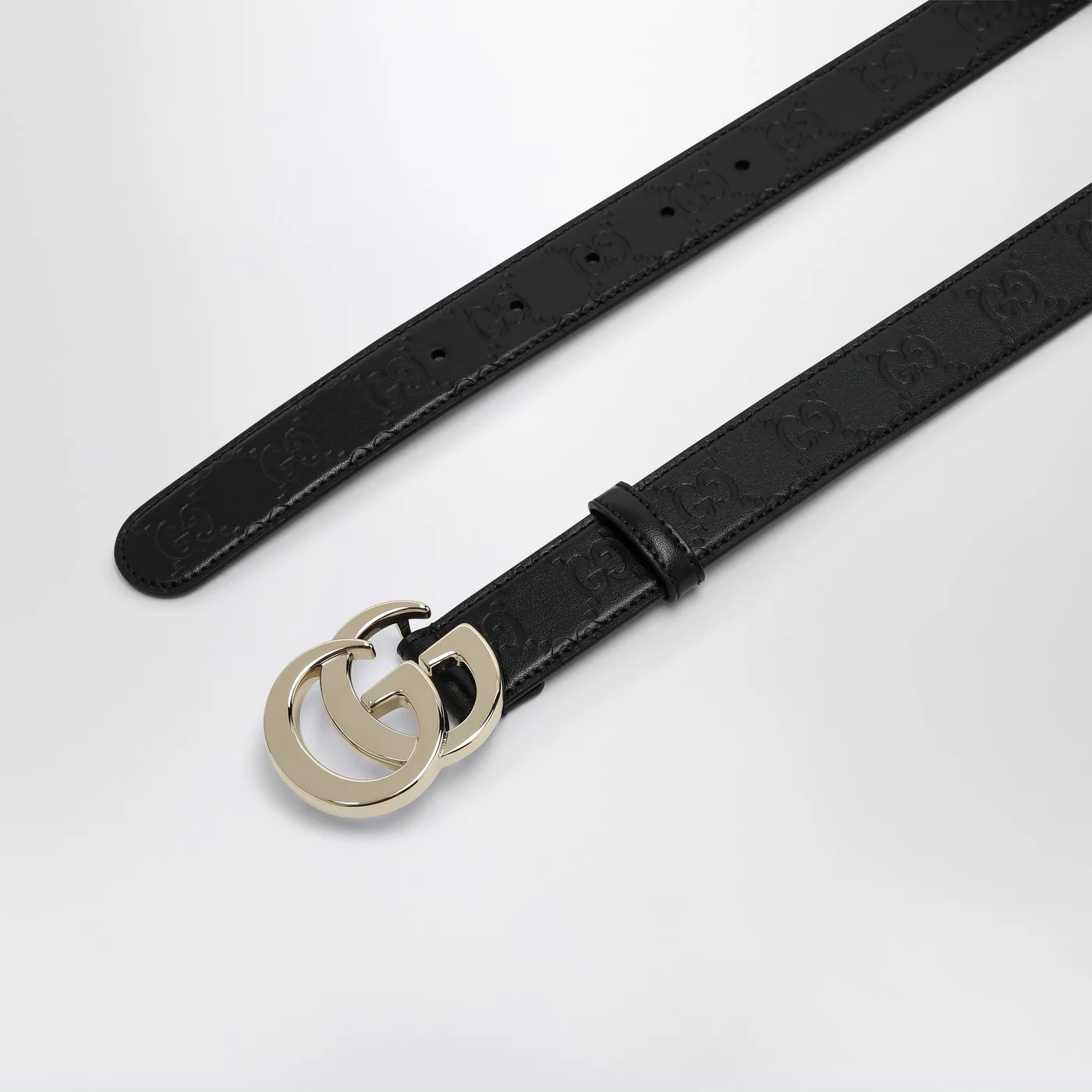 Cintura di Gucci in pelle GG nera, caratterizzata da fibbia doppia G in metallo con finitura oro chiaro e passante.