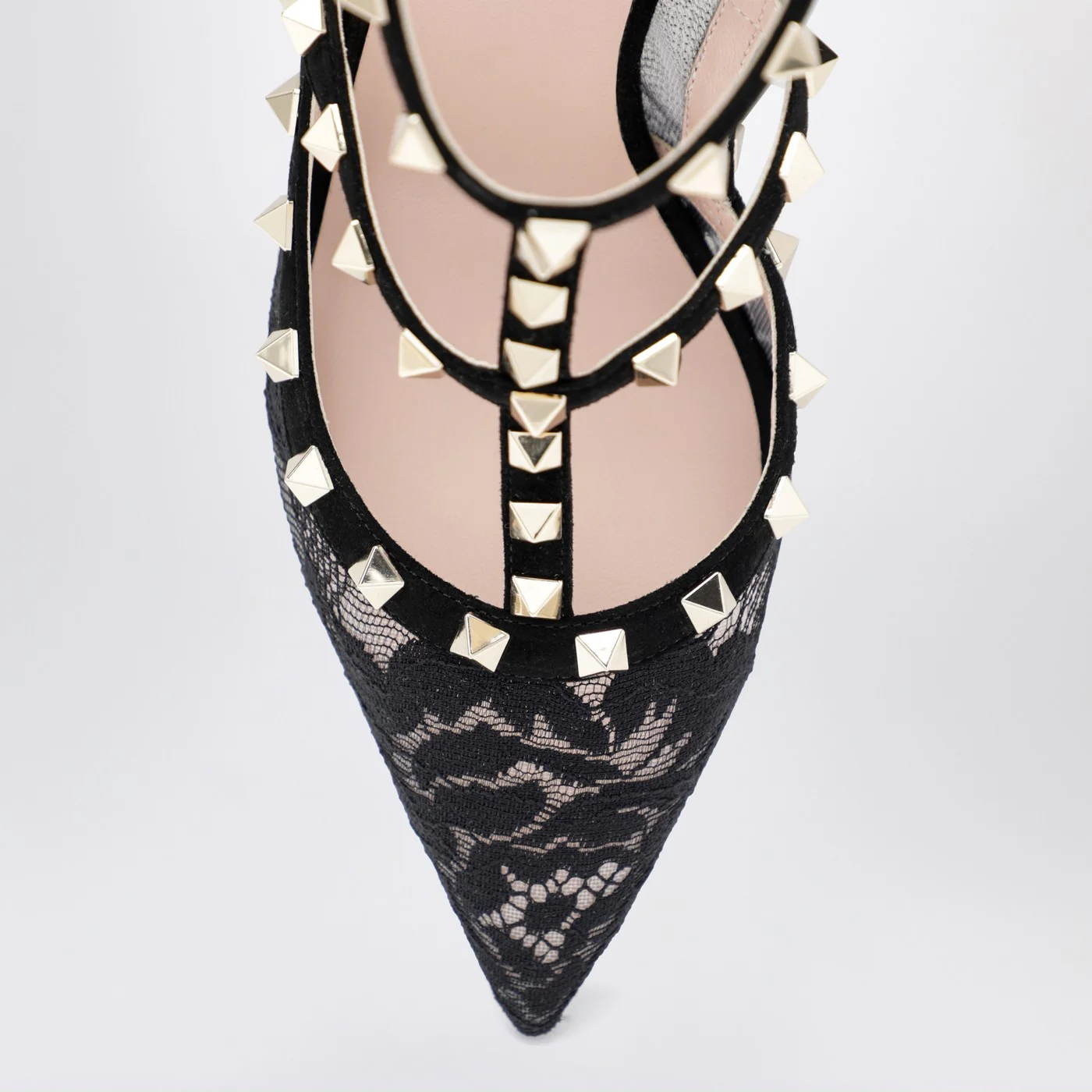 Décolleté di Valentino Garavani con tomaia in pizzo nera, caratterizzata da cinturini regolabili alla caviglia, borchie finitura platino, profili in camoscio, design a punta, tacco alto e suola in cuoio.