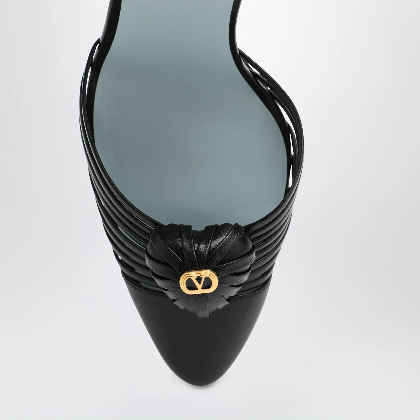 Décolleté di Valentino Garavani in pelle nero, caratterizzata da punta a gabbia con dettaglio cuore, cinturino con fibbia alla caviglia, tacco alto a stiletto e suola in cuoio.