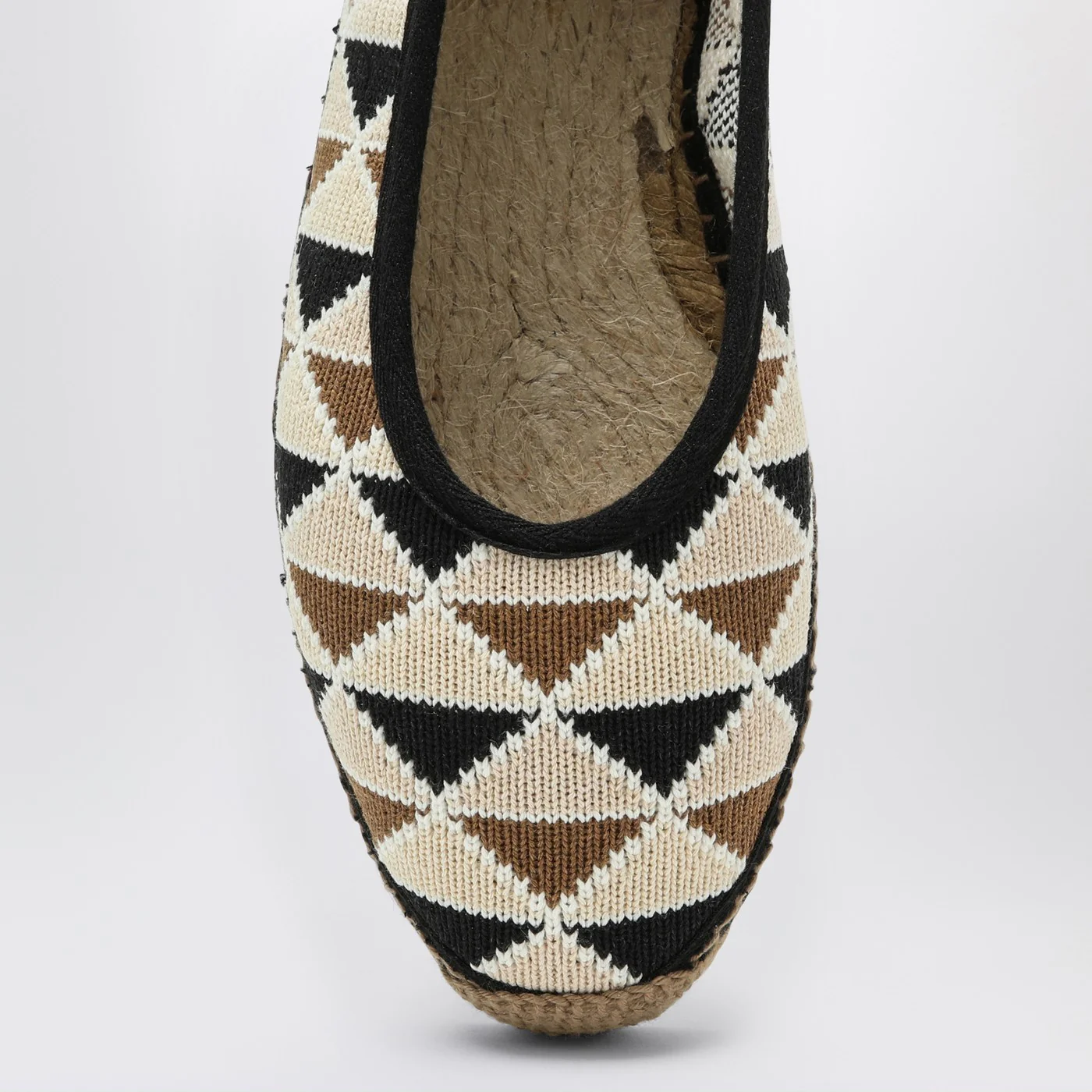 Espadrillas bassa di Castañer caratterizzata da tomaia in crochet multicolore con motivo geometrico, soletta con stampa logo, punta tonda, chiusura alla caviglia con lacci neri e suola bassa in raffia color naturale.
