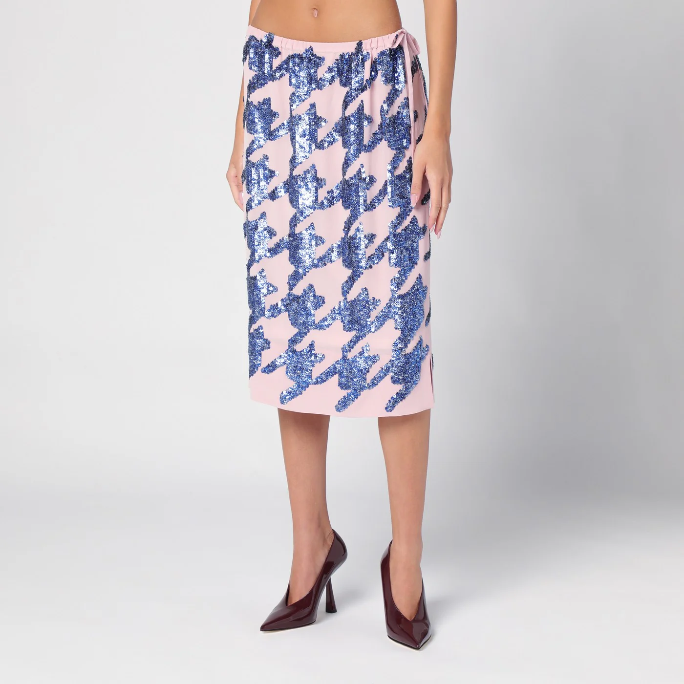 Gonna di Dries Van Noten in seta rosa, caratterizzata da trama con paillettes a contrasto, coulisse regolabile in vita e piccolo spacco laterale.