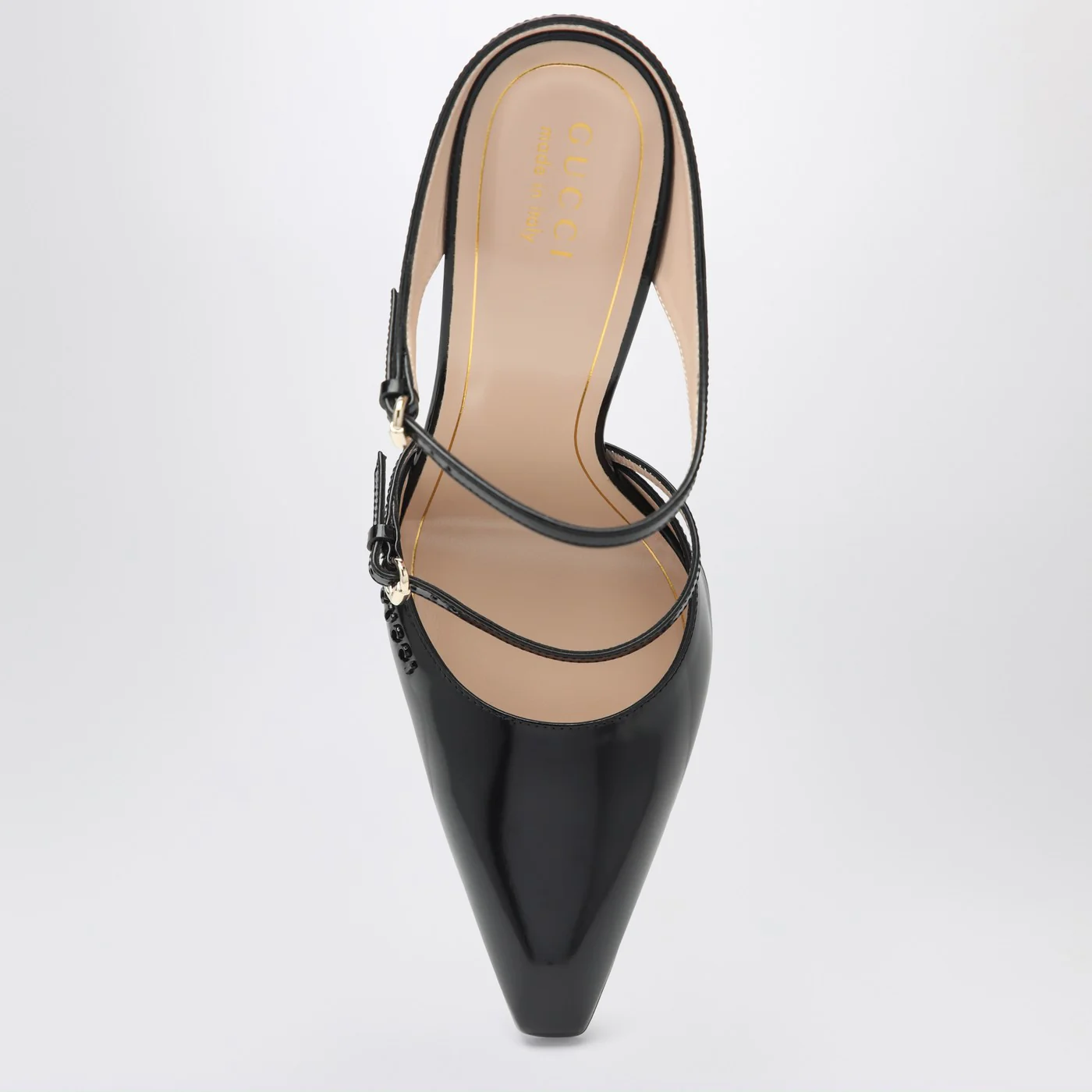 Sabot di Gucci in pelle lucida nero, caratterizzato da punta allungata, finiture color oro chiaro, logo lettering in rilievo sulla tomaia, zeppa con finitura trasparente con targhetta logata in metallo all'interno e cinturini con fibbie regolabili.